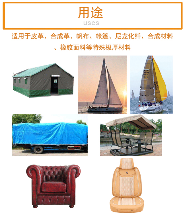 用途:適用于皮革、合成革、帆布、帳篷、尼龍化纖、合成材料、橡膠面料等特殊極厚素材;適用縫制船帆帳篷、坐墊、家具沙發(fā)、遮陽傘、卡車篷罩等大型特殊極厚料產(chǎn)品。